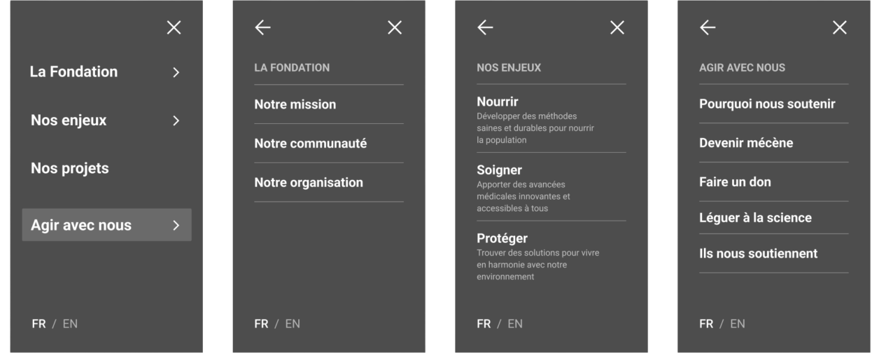 Plus concrètement, voici un exemple d’UX mobile pour la Fondation One science qui présente le fonctionnement du menu : chaque entrée affiche un écran intermédiaire avec ses sous-rubriques (mission, communauté, organisation…), illustrant la structure de navigation.
