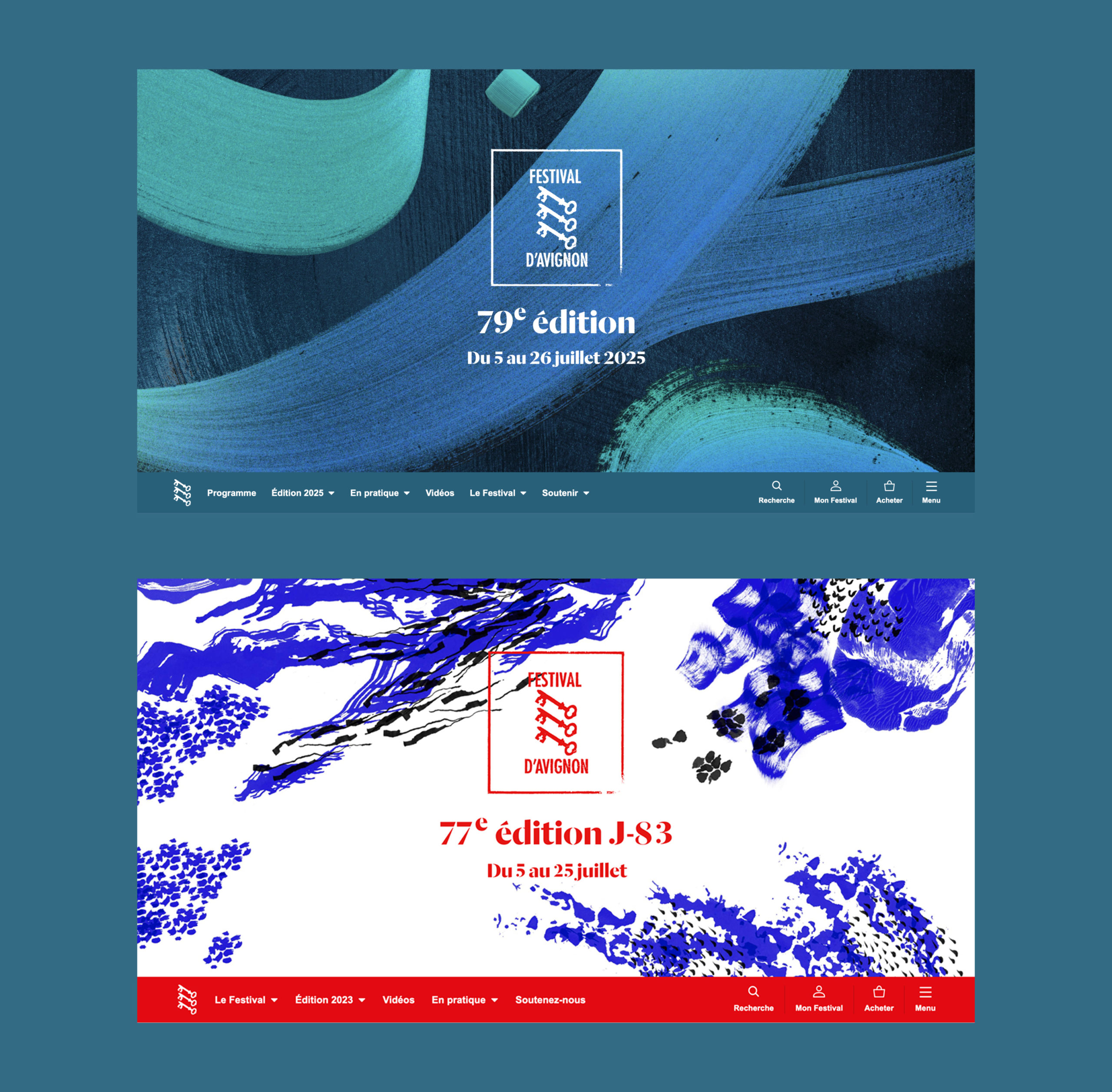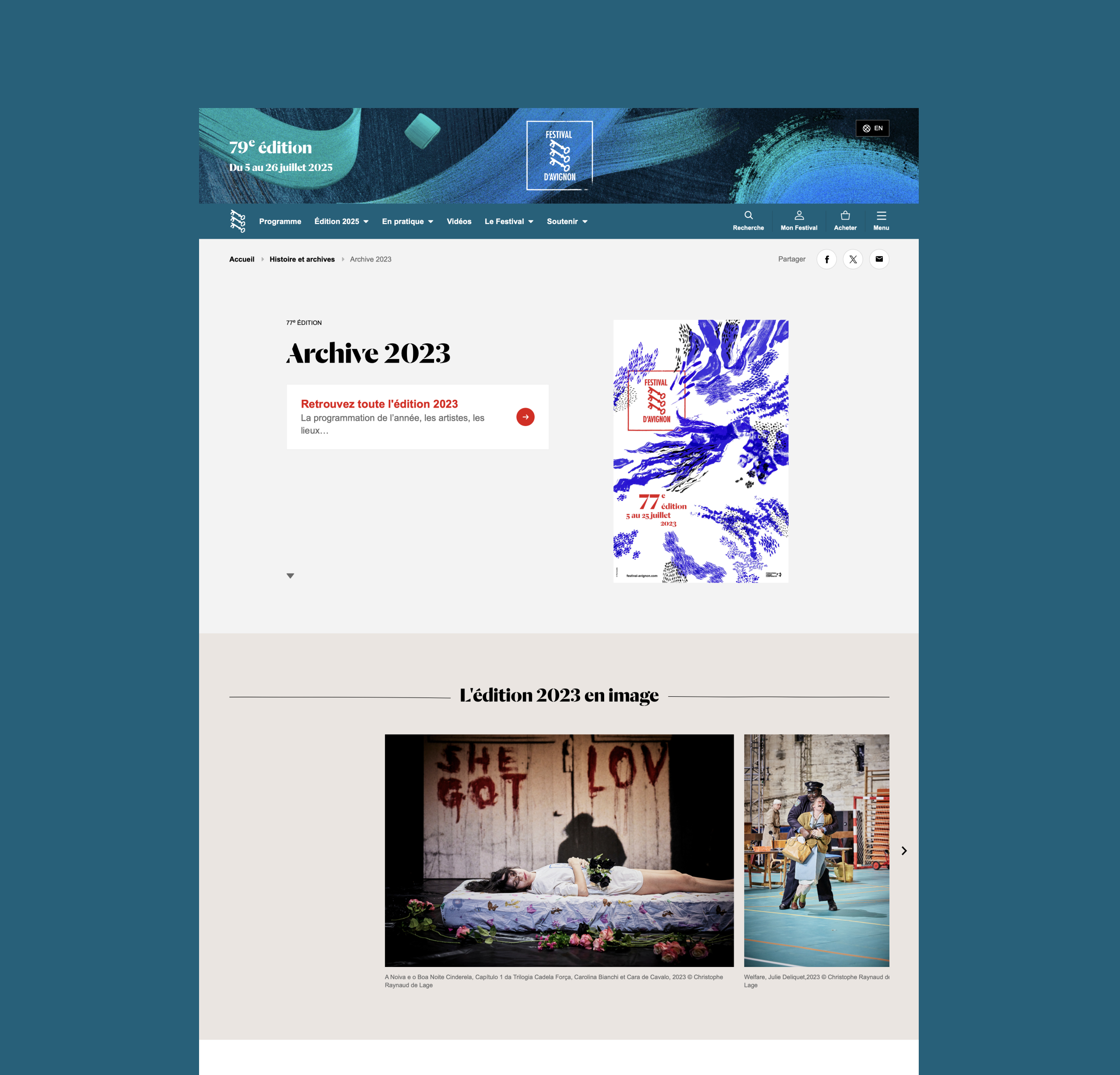 Le site internet du Festival prend chaque année les couleurs de la saison en cours. Il doit traduire les 2 moments clés du festival : la période programmation du festival, dès l’ouverture de billetterie, et la période hors festival. La page d’accueil et la navigation s’adaptent selon la période pour répondre aux besoins de l’utilisateur.
