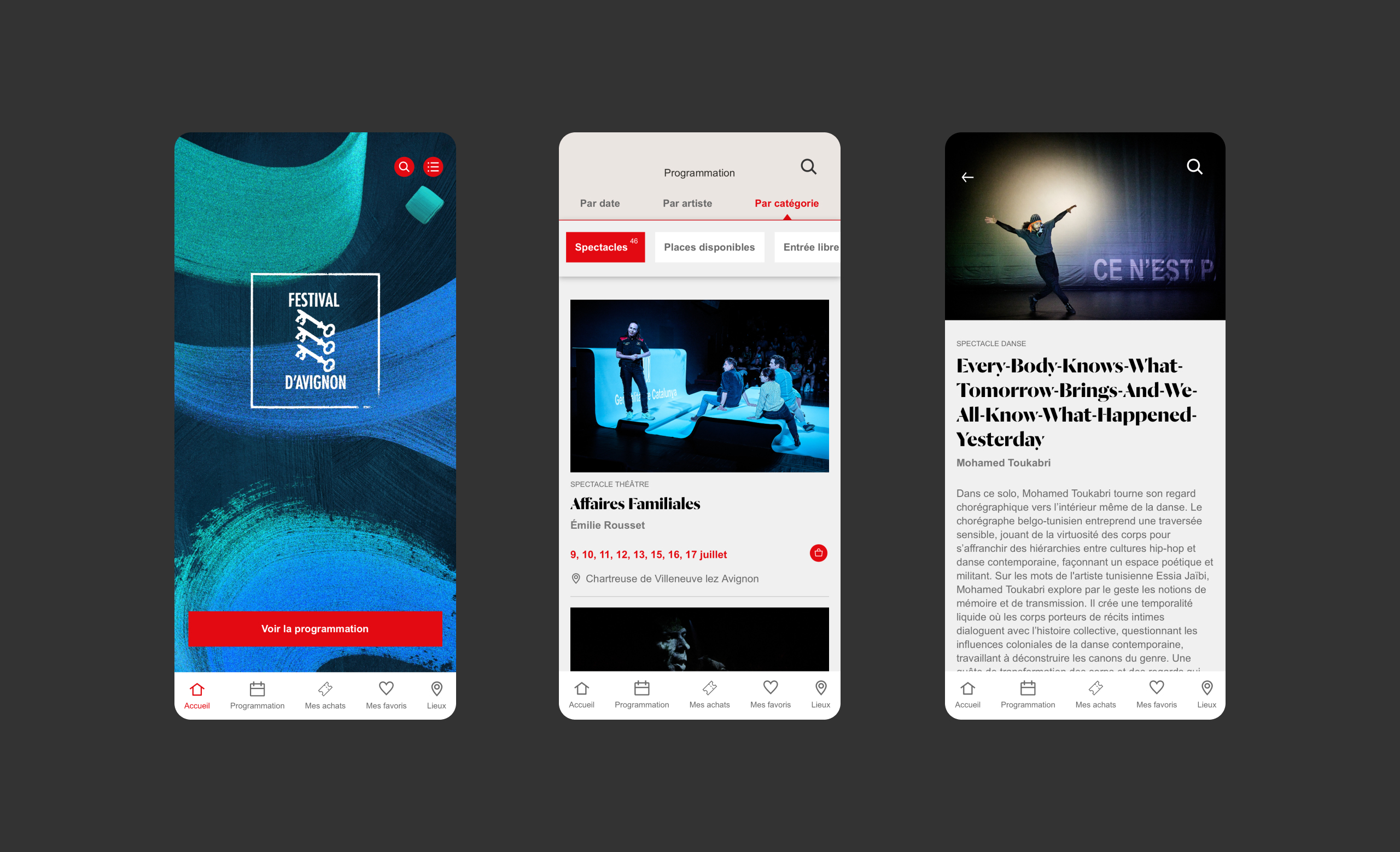 Nous avons prolongé sur l’app mobile le travail de design mené précédemment sur le site, afin de créer une parfaite cohérence entre les deux objets numériques. L’application recense toutes les représentations du festival, gratuites et payantes. Articulée avec la billetterie du festival, l’application permet d’acheter ses billets et d’accéder à ses billets dématérialisés. En outre, elle permet au festival de notifier les spectateurs qui le désirent des spectacles disponibles à la dernière minute…