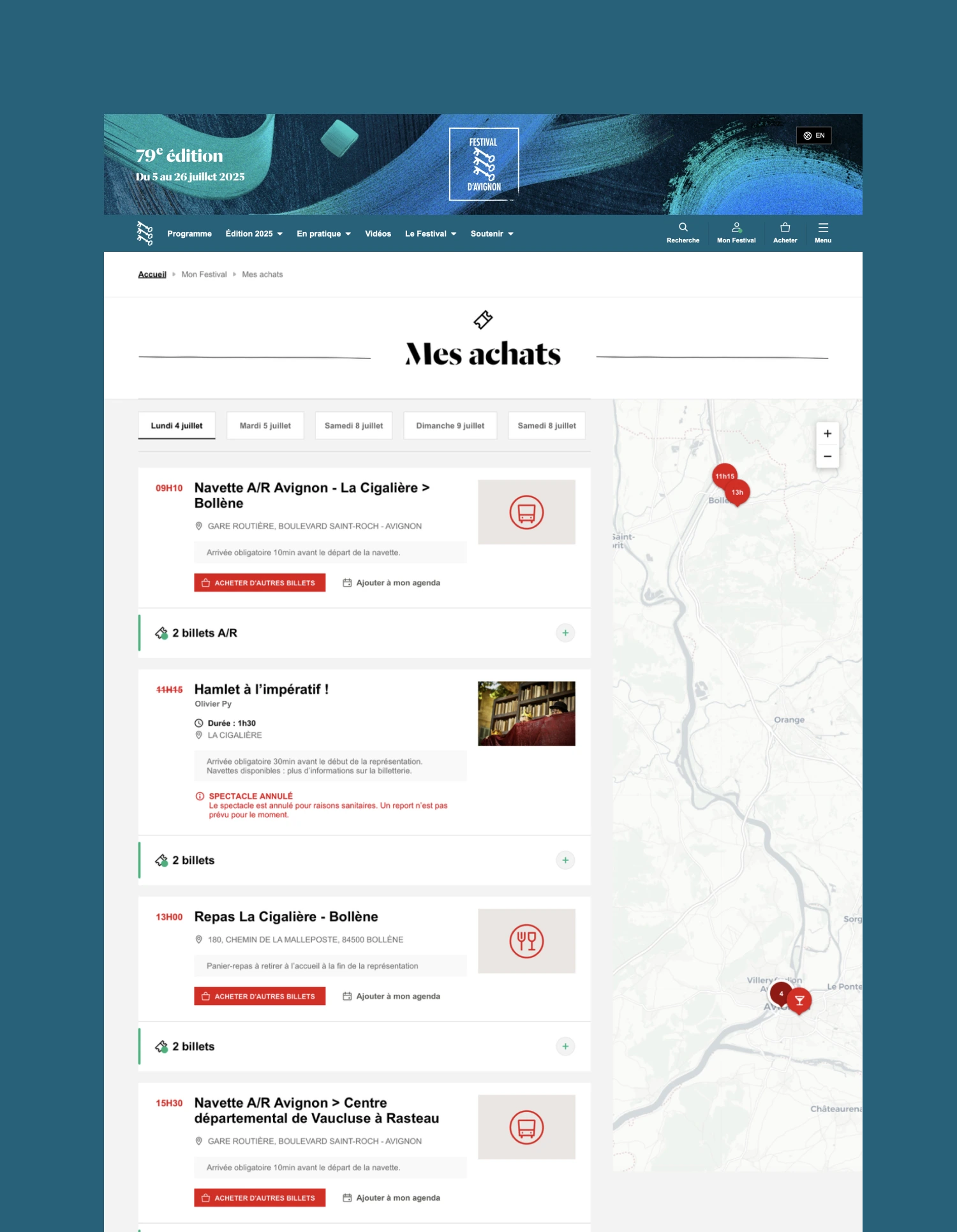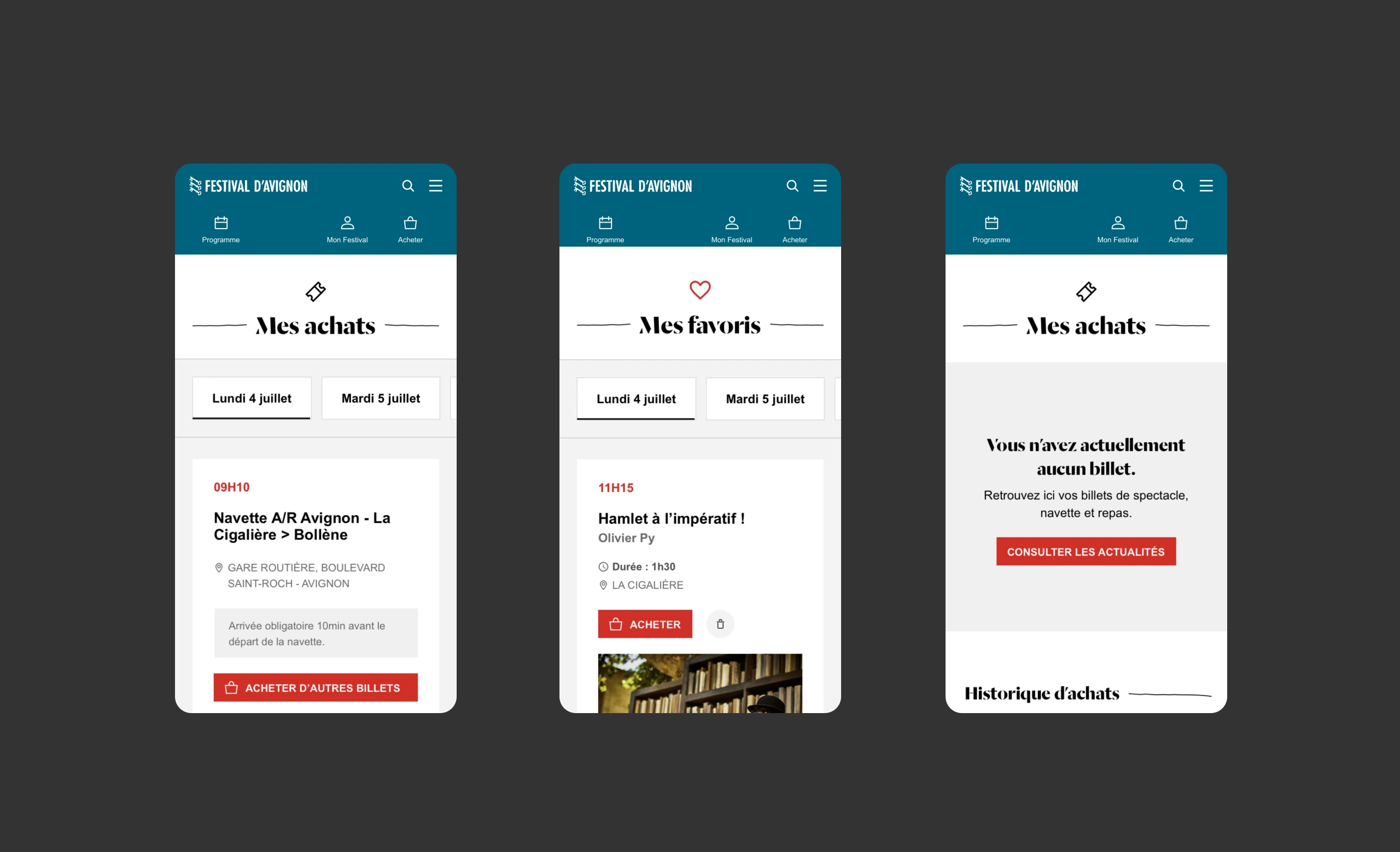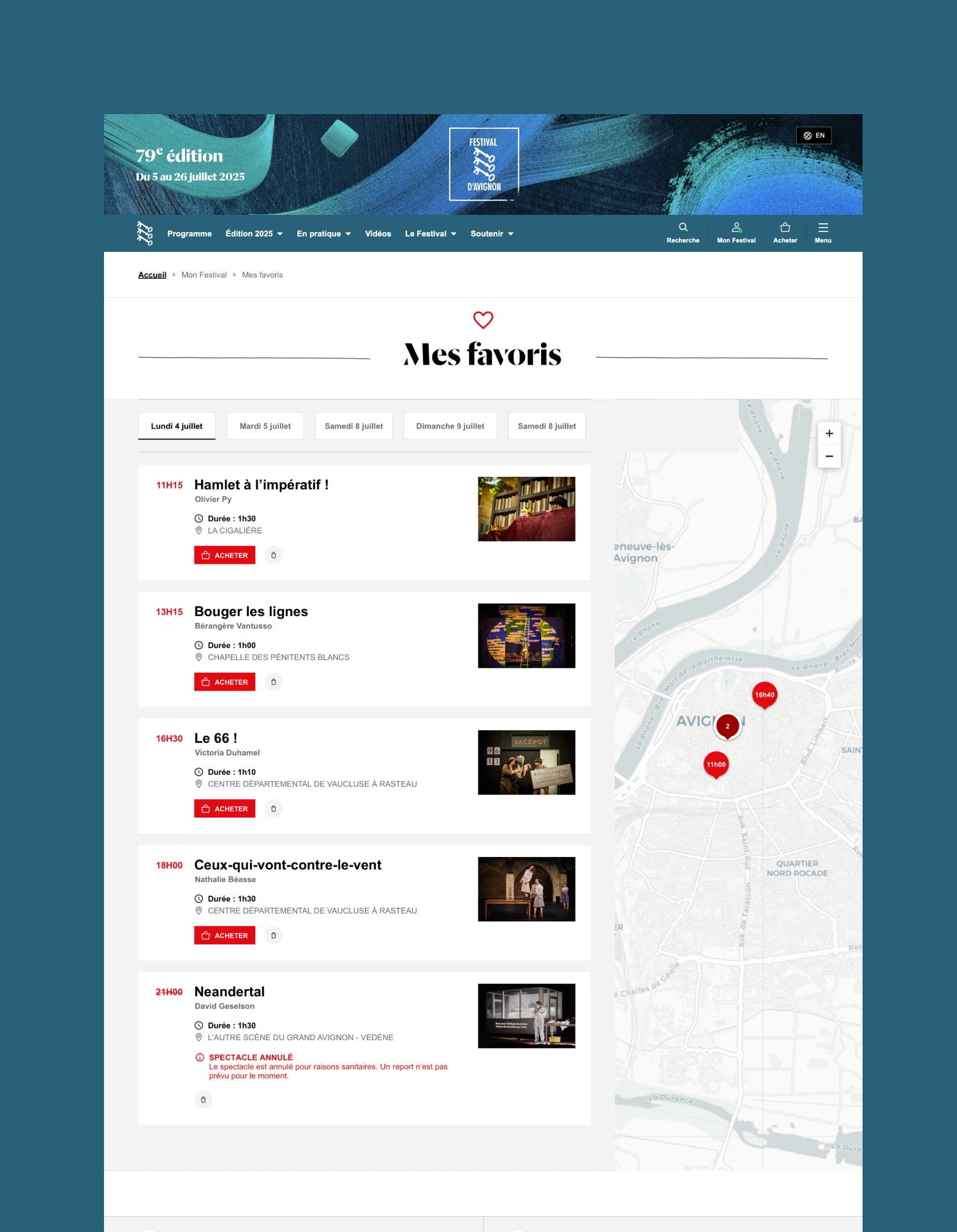 Nous avons amélioré l’expérience utilisateur d’achat de billets et de préparation du festival, notamment avec l’optimisation de l’outil Parcours mis en place en 2014, désormais scindé en 2 rubriques : Mes favoris / Mes achats. Ces outils permettent de préparer sa venue au festival en créant une liste d’envie de spectacles et événements, pour ensuite la soumettre en billetterie.