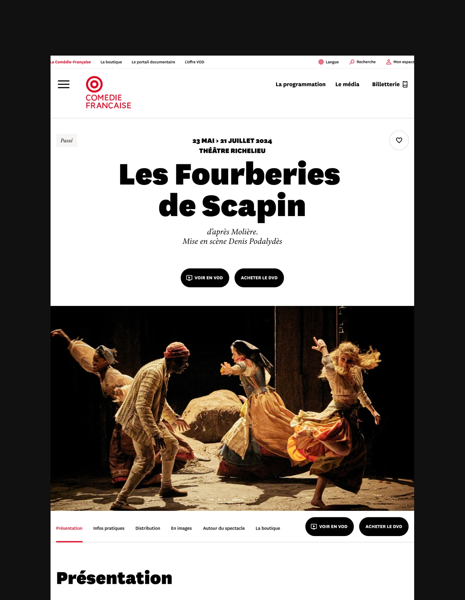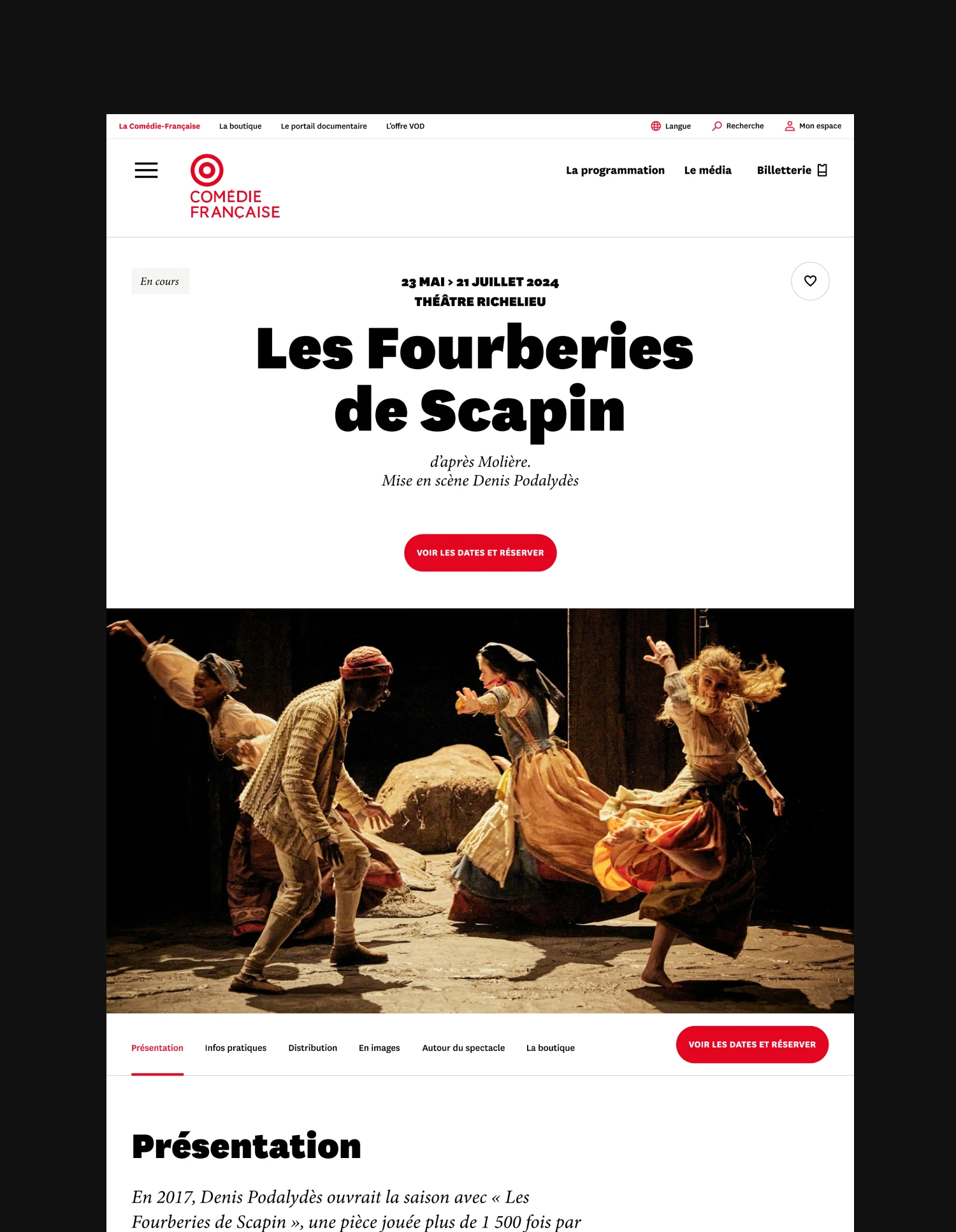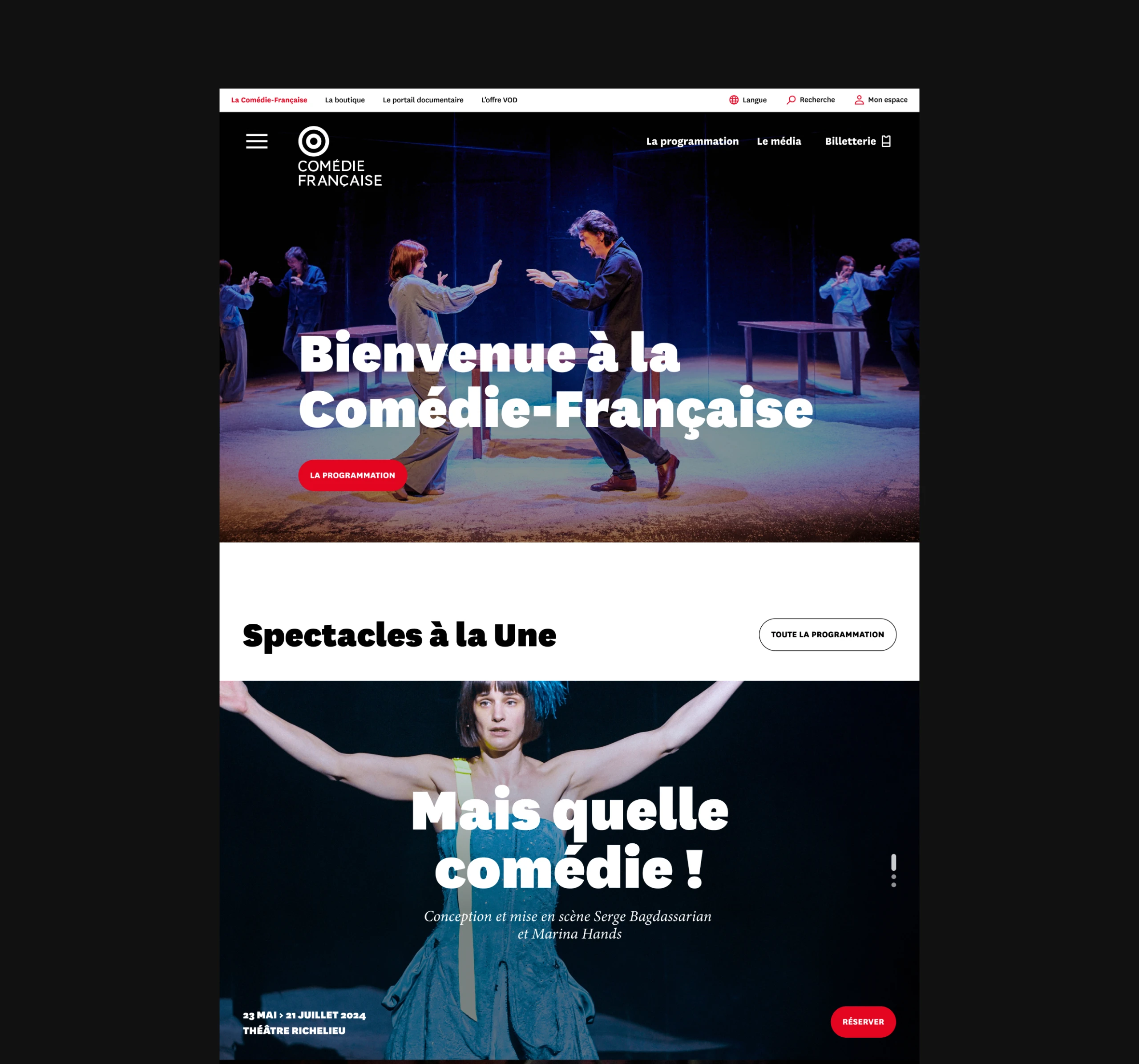 Soucieuse de moderniser son image et de s’adresser à un public plus large, la Comédie-Française nous a permis, dans le cadre d’un appel d’offre, de nous exprimer sur la refonte ergonomique et graphique de son site internet. Les enjeux de la refonte sont les suivants :