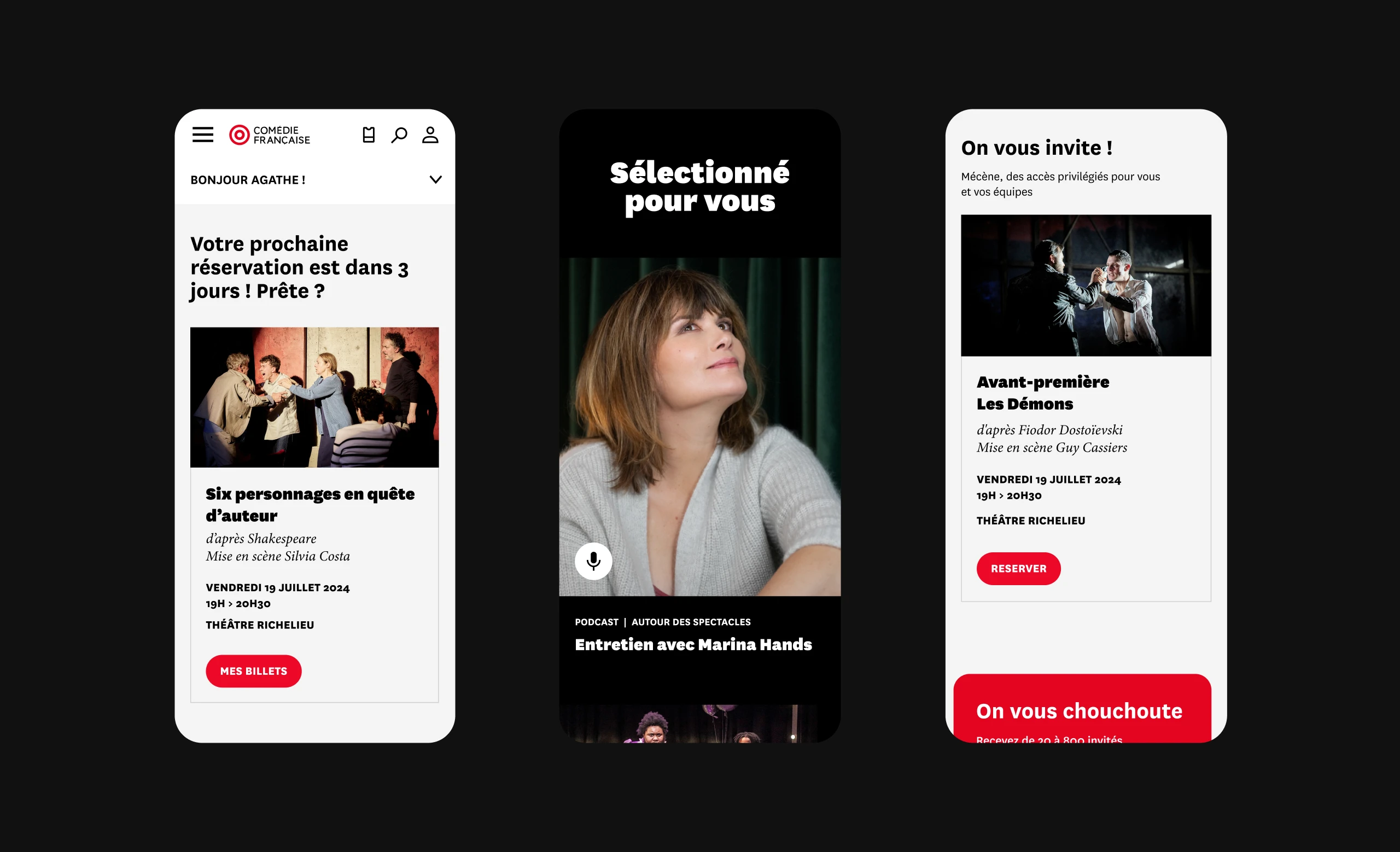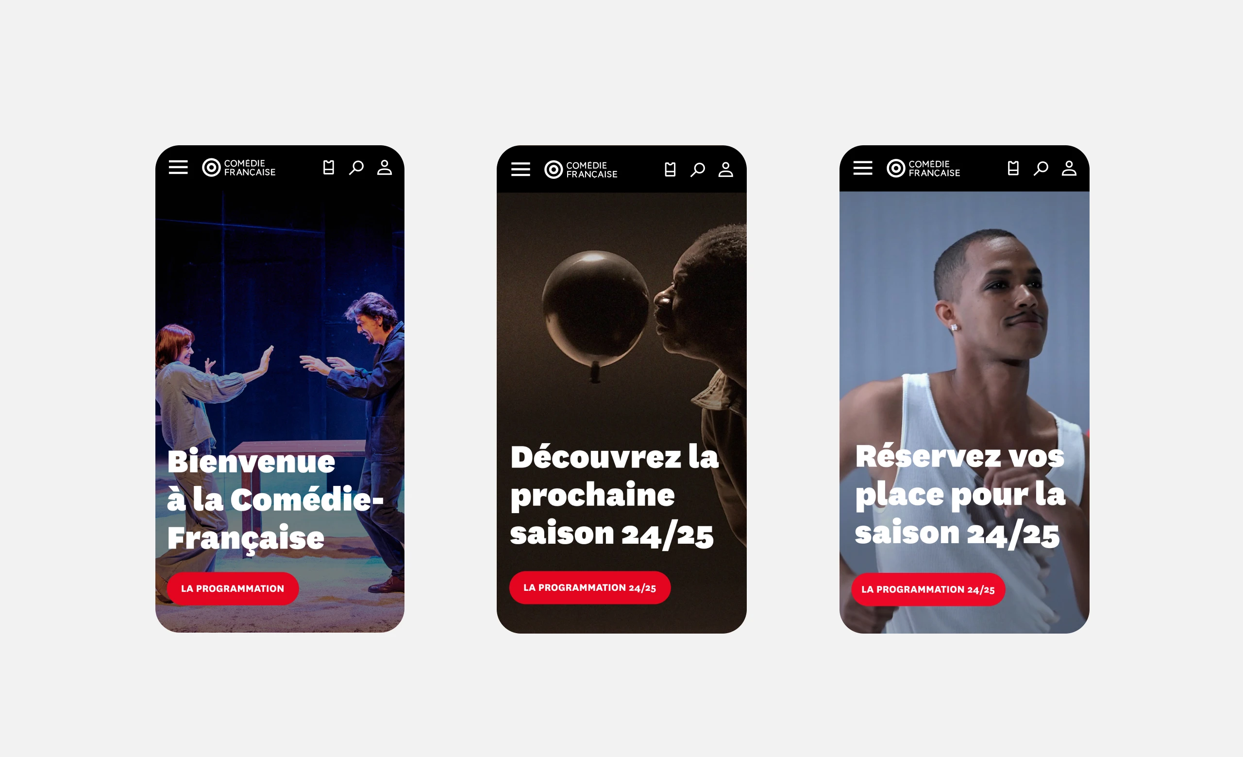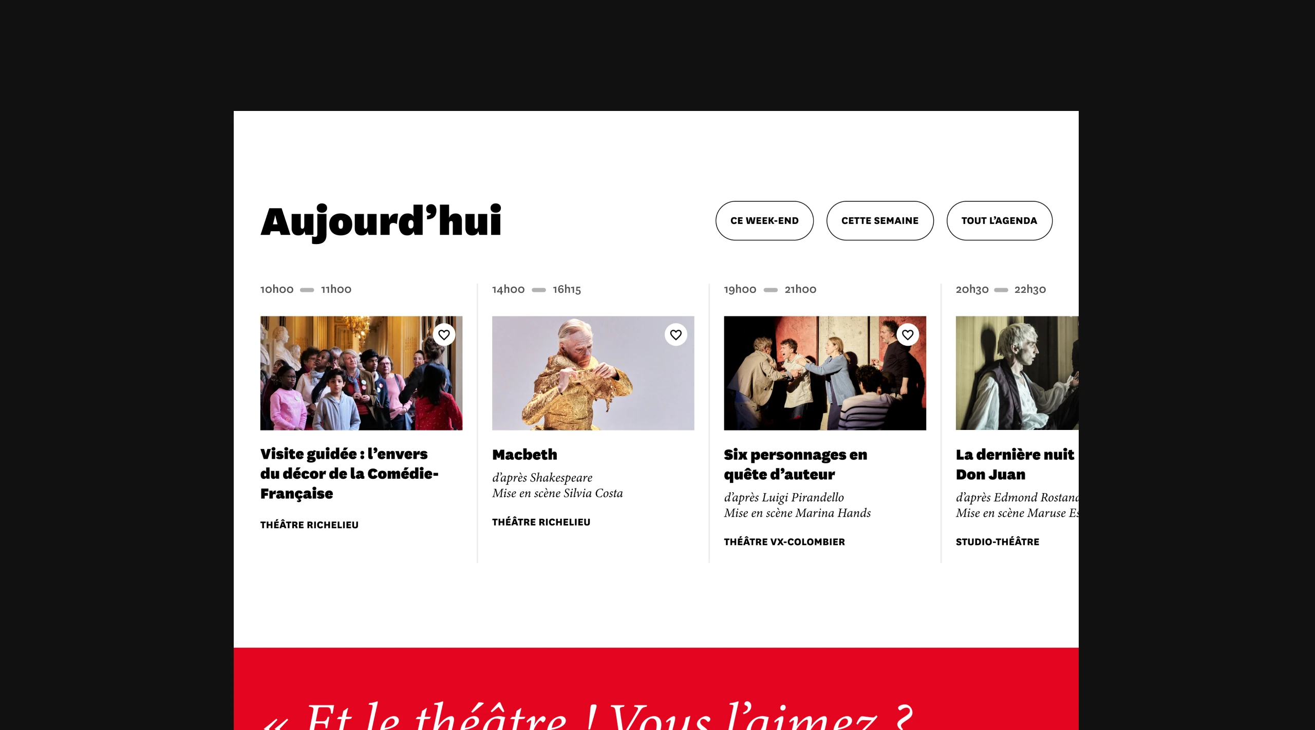Soucieuse de moderniser son image et de s’adresser à un public plus large, la Comédie-Française nous a permis, dans le cadre d’un appel d’offre, de nous exprimer sur la refonte ergonomique et graphique de son site internet. Les enjeux de la refonte sont les suivants :