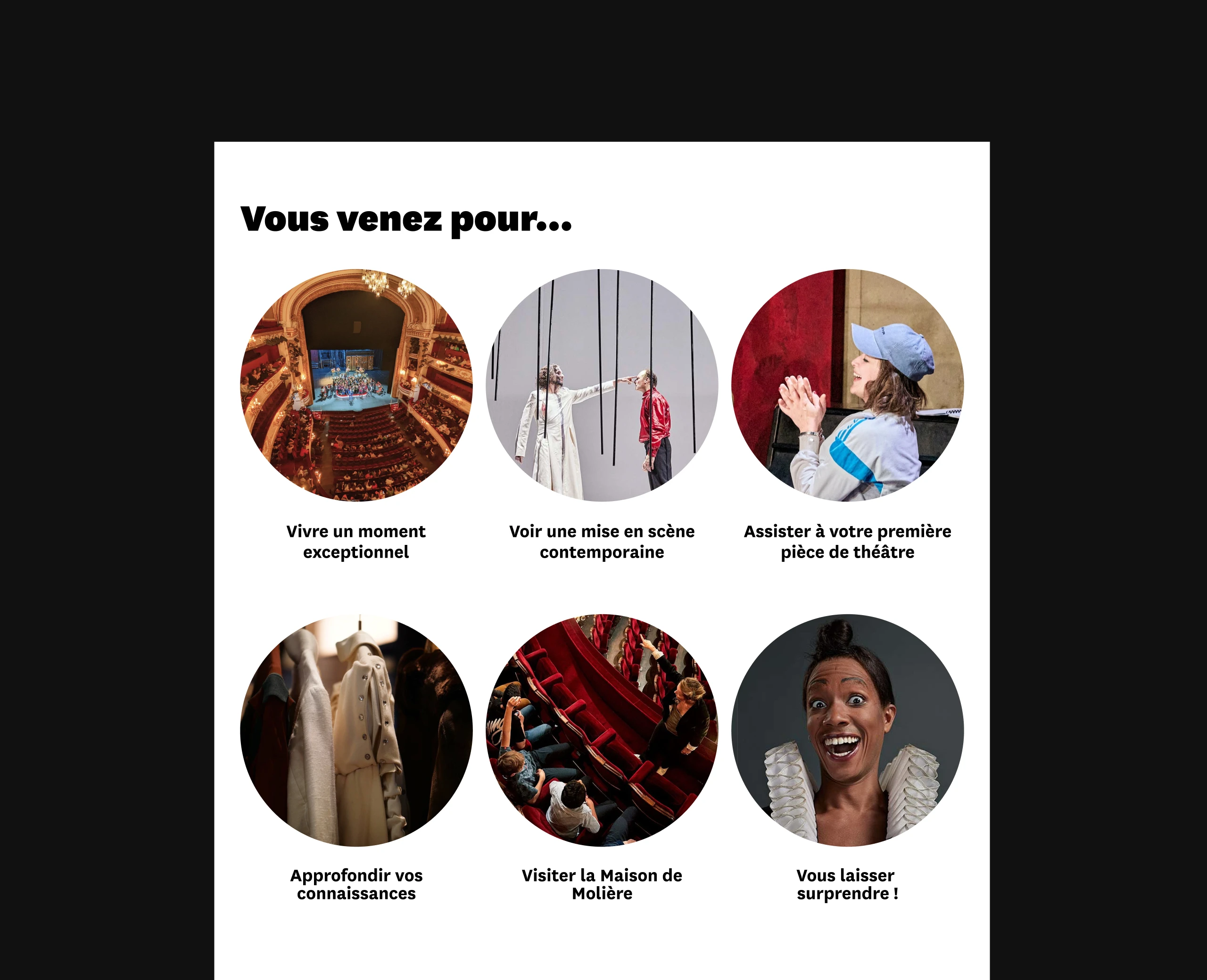 La nouvelle identité numérique propose un positionnement plus grand public, accessible et moderne, tout en préservant l’image prestigieuse de la « Maison de Molière ». La direction artistique repose sur les principes-clé suivants :